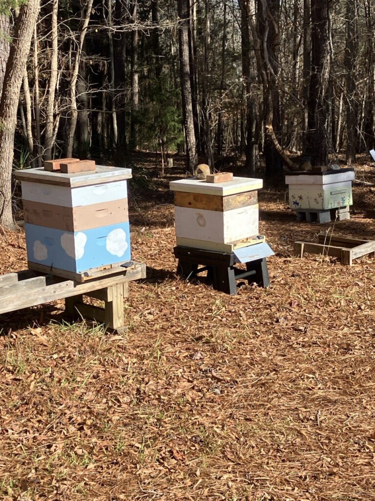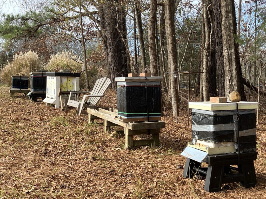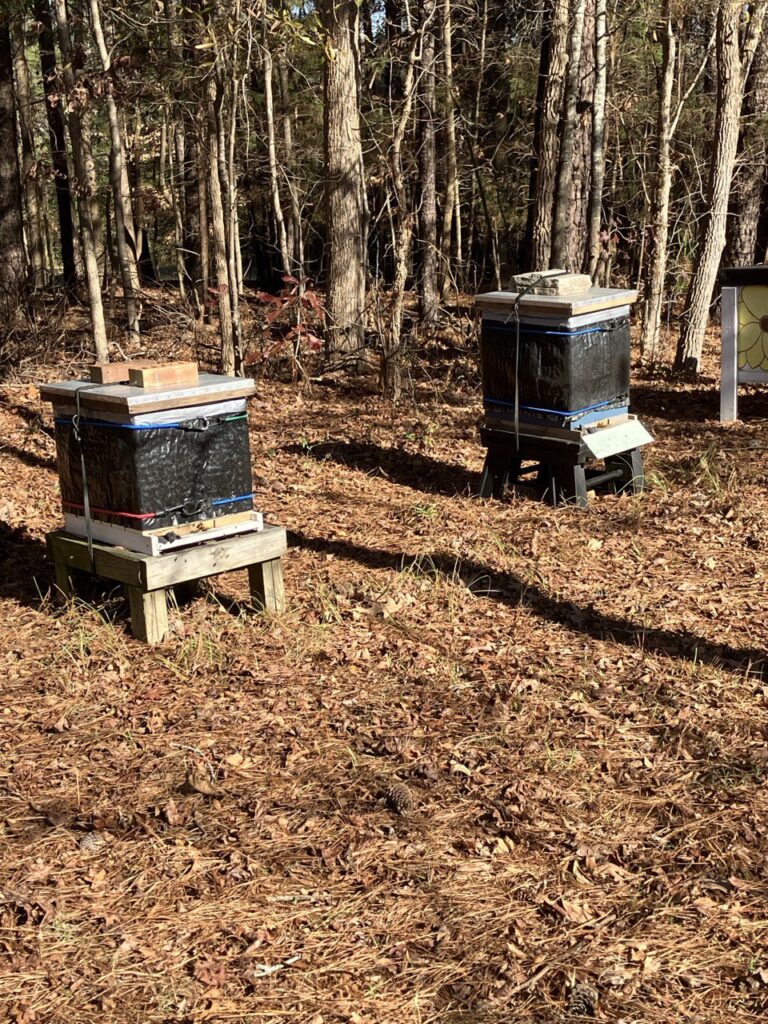 One thing that I do, that most clubs do not suggest, is that I wrap my hives in the winter. Here in North Carolina, with all the weather tactics, we have 75 degrees one day and 50 the next. Lows can be anywhere from 60 at night to 25 at night. A dark wrap gives the bees a bit more control on the temp inside the cluster and the darker the wrap, the more the hives absorbs the sun. The wrap also keeps out the wind, although their propolis does a very good job with that.